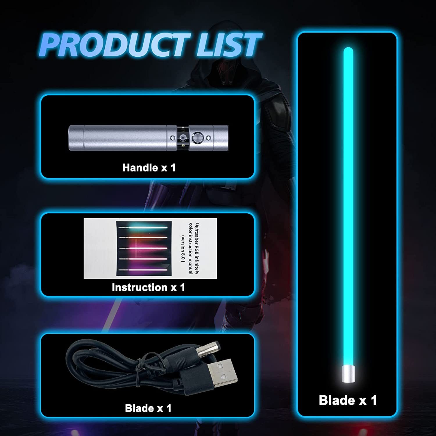 - 【Rechargeable Light Saber】The RGB light FX saber is equipped with a USB charging cord and a 2000mah battery. It takes 3 hours to fully charge and can be used continuously for 4 hours (Note: Please use 5V 1A charging head to charge)